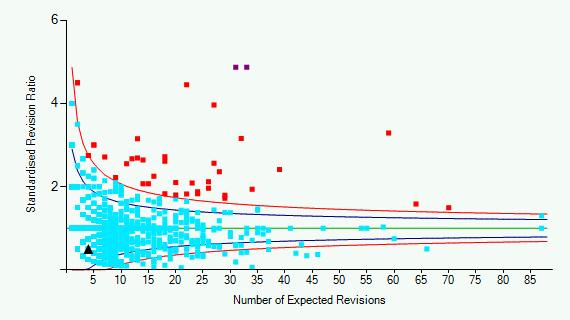 The government plans to publish results for all surgeons so that patients can make an informed decision on who to choose. This is something that Mr Banim agrees with. It is planned that mortality rates and the number of cases will be published (Mr Banim does many more hip replacements than average, and has a lower mortality rate). Another important measure is the number of patients that require later revision, and his results, as collected by the National Joint Register, are also better than average, as shown by the triangle on the graph below.